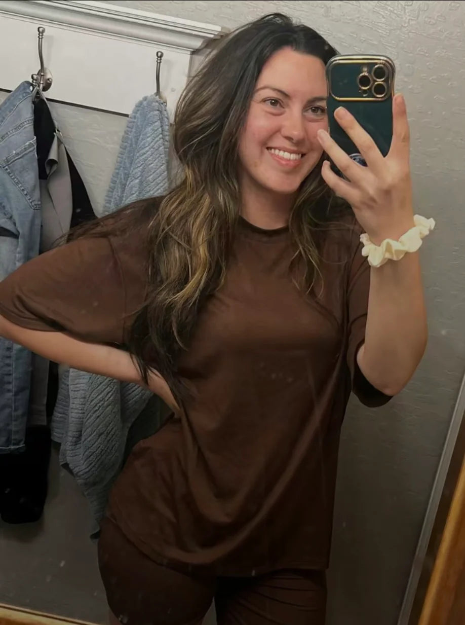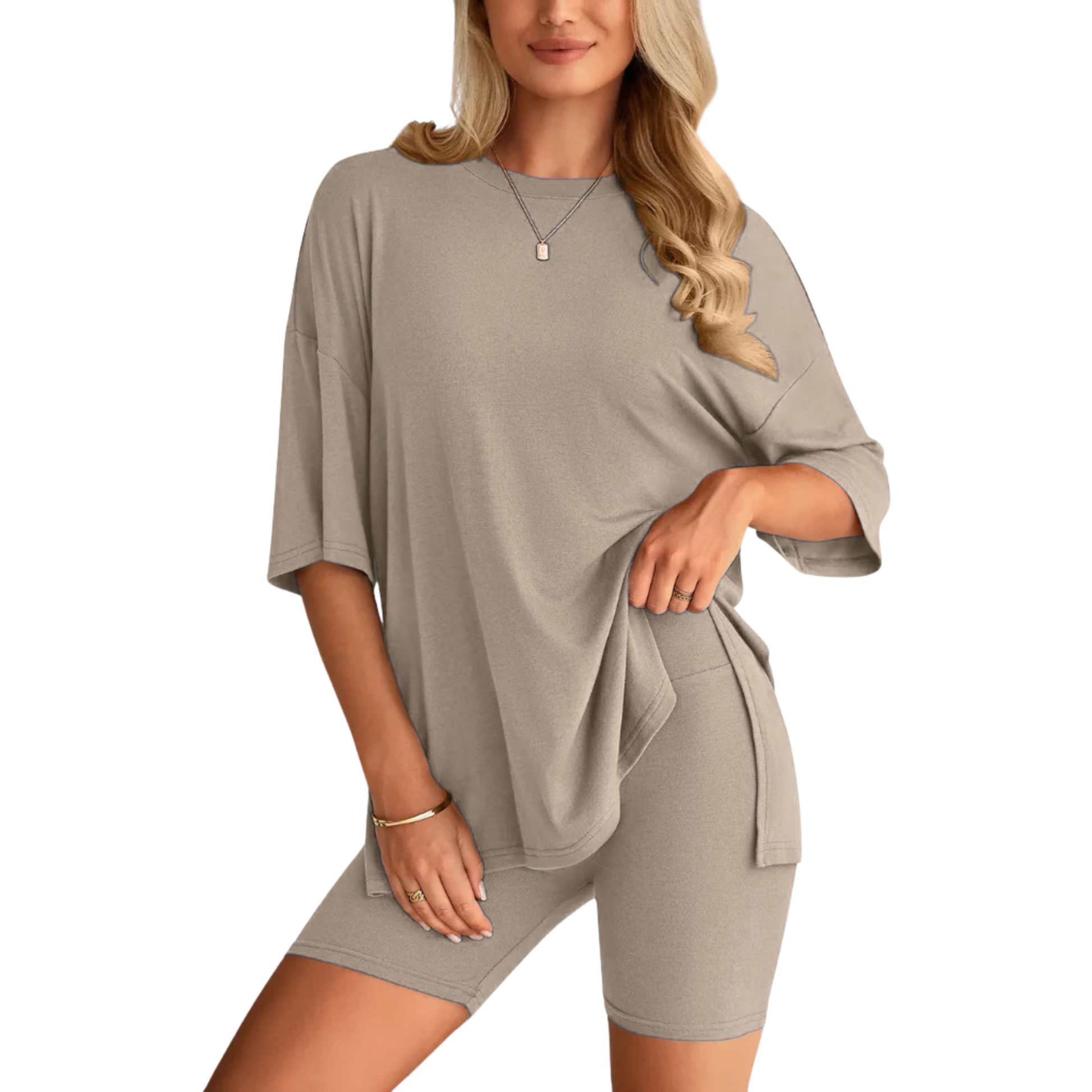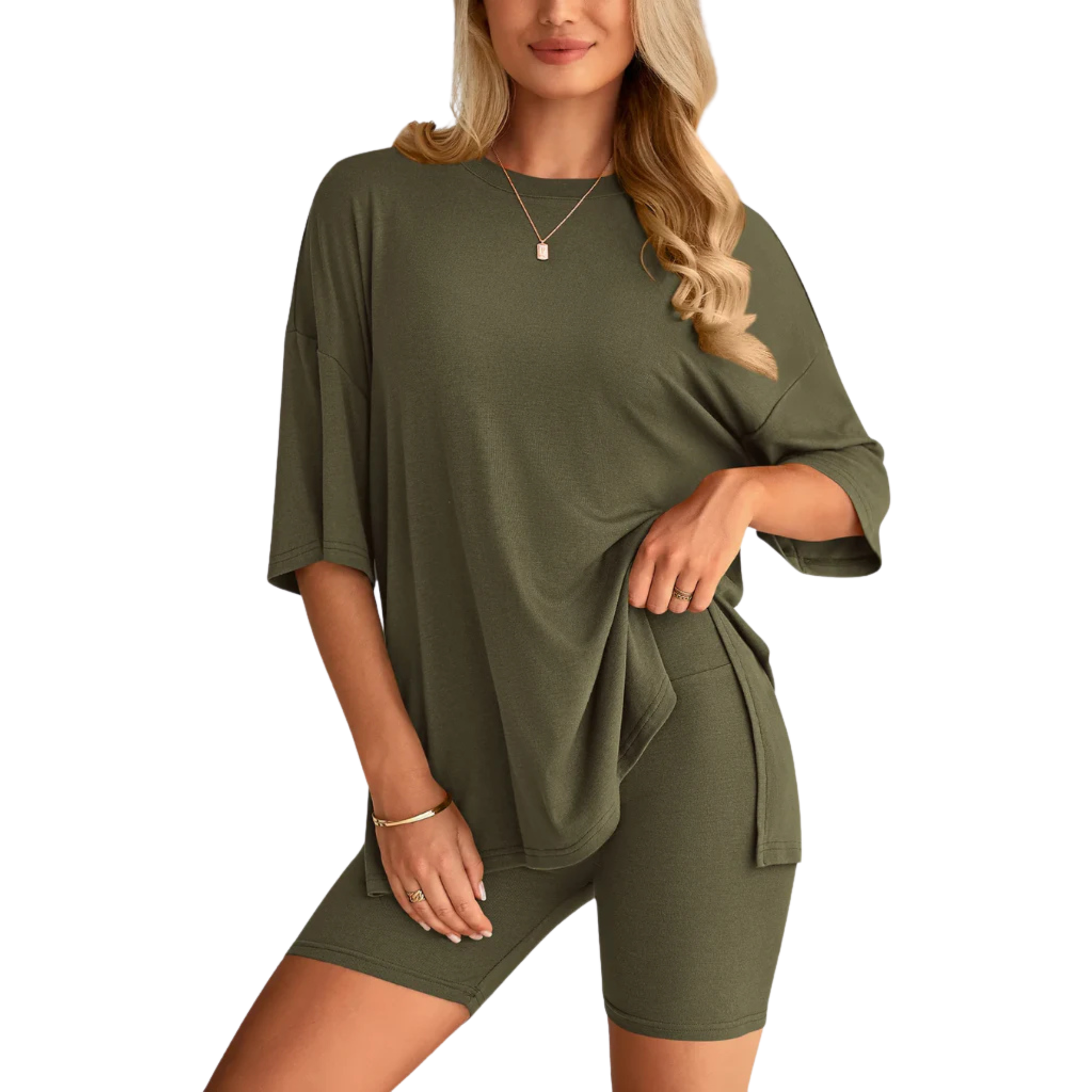 Absolutely. The high-stretch shorts and oversized shirt are perfect for bumps and beyond. It’s a favorite among expecting mamas.