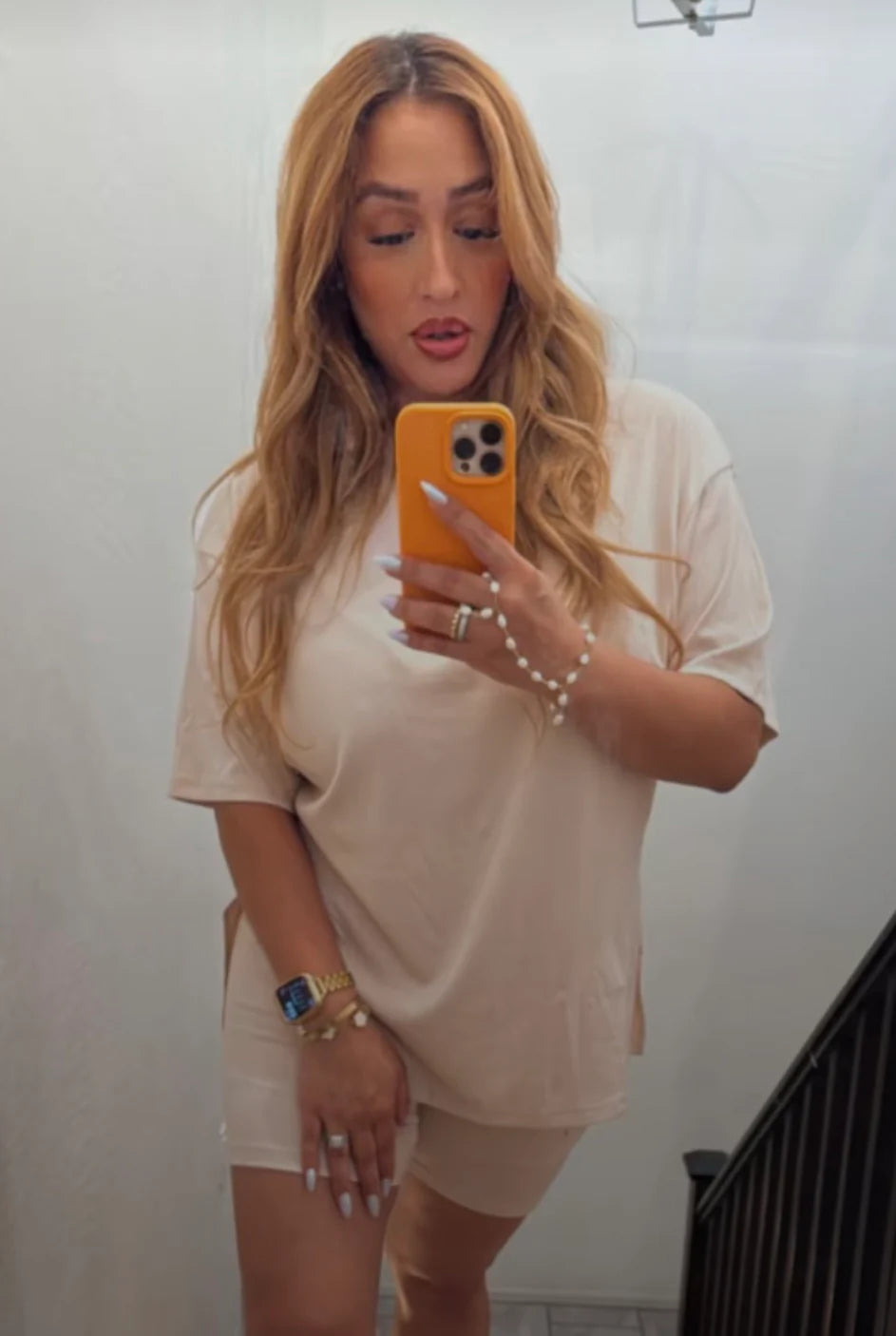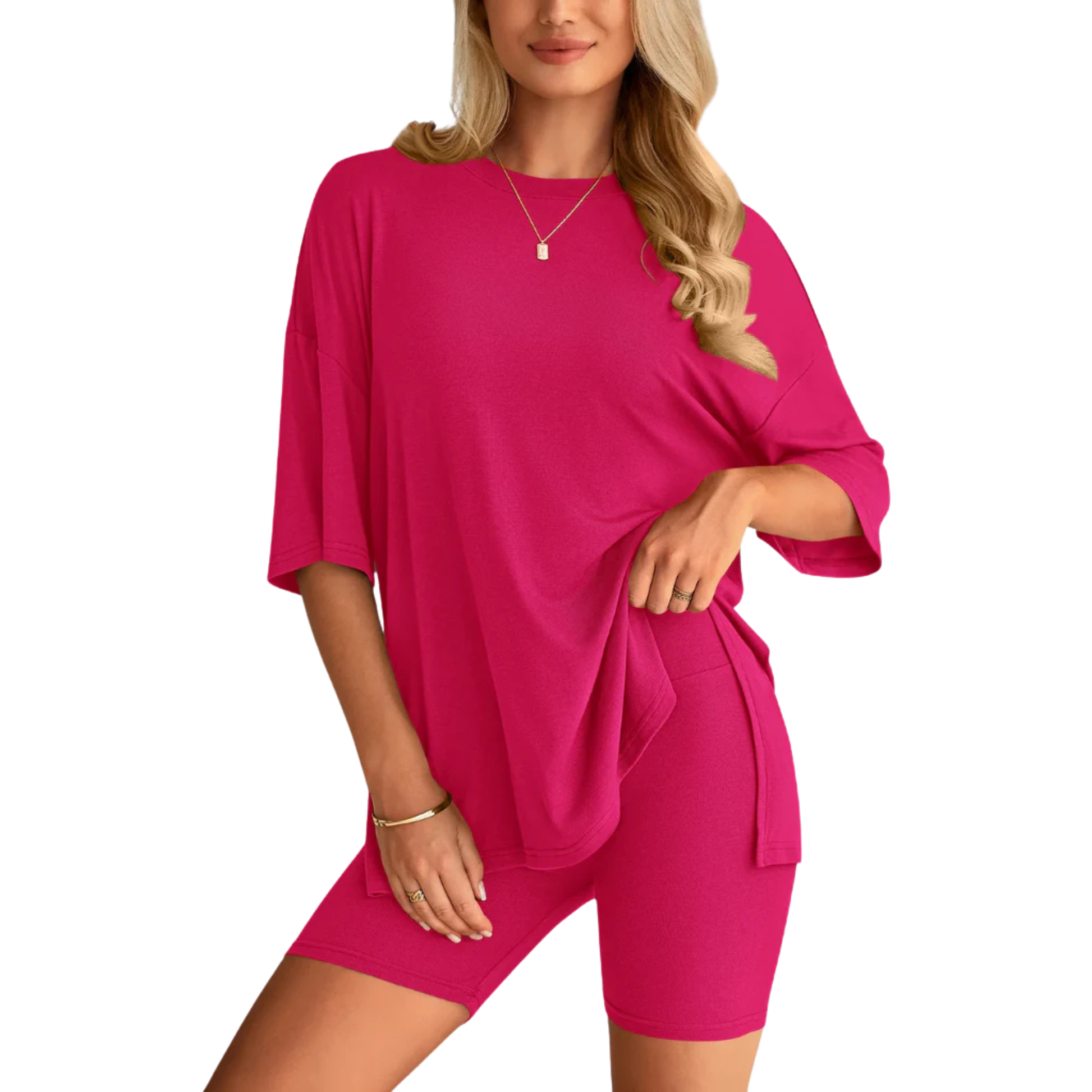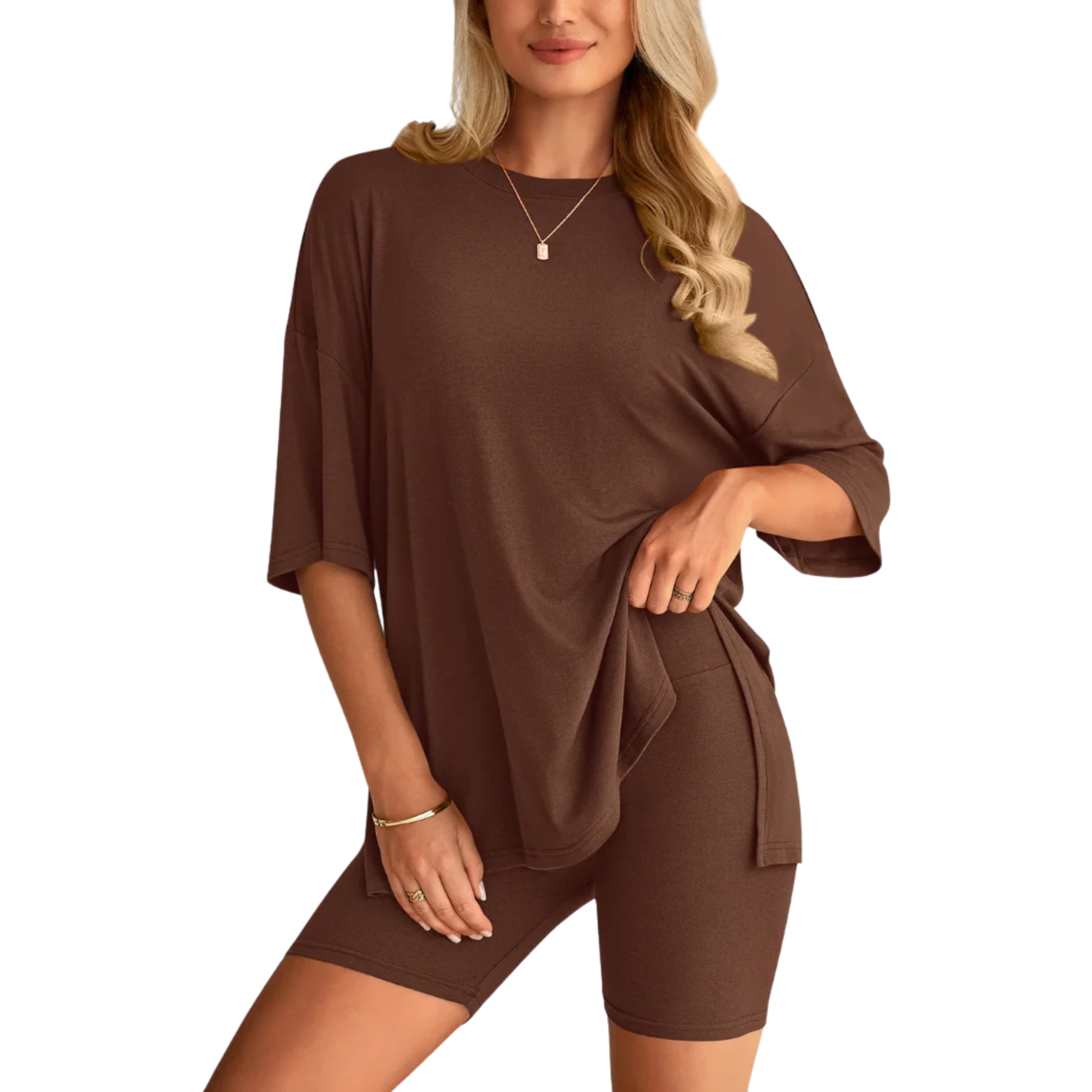 Absolutely. The high-stretch shorts and oversized shirt are perfect for bumps and beyond. It’s a favorite among expecting mamas.